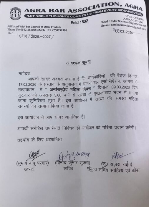 आगरा बार एसोसिएशन द्वारा आगामी 9 मार्च 2026 को ‘अंतरराष्ट्रीय महिला दिवस’ के उपलक्ष्य में एक विशेष कार्यक्रम का आयोजन किया जा रहा है। 3