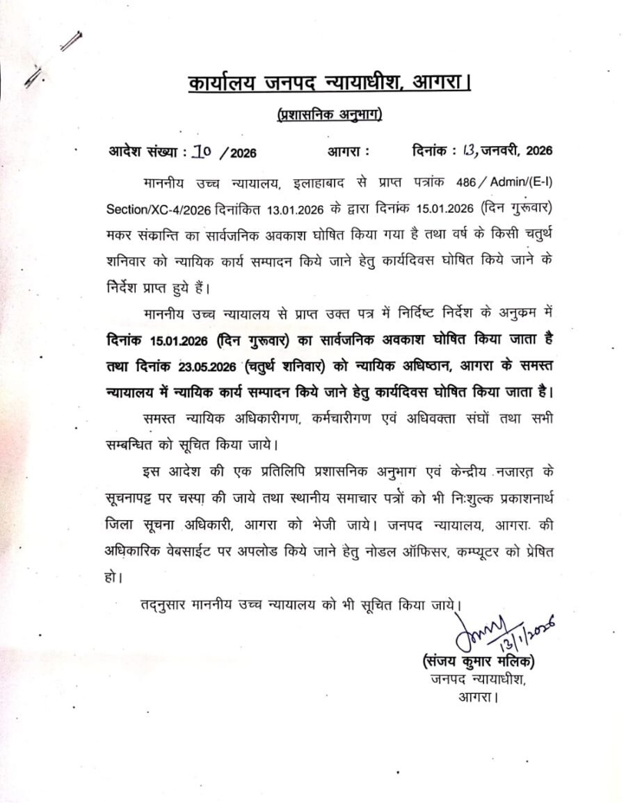 जनपद न्यायाधीश आगरा, माननीय संजय कुमार मलिक द्वारा जारी आदेश के अनुसार, आगरा जनपद के समस्त न्यायालयों में 15 जनवरी 2026 (गुरुवार) को मकर संक्रांति के उपलक्ष्य में सार्वजनिक अवकाश घोषित किया गया है।