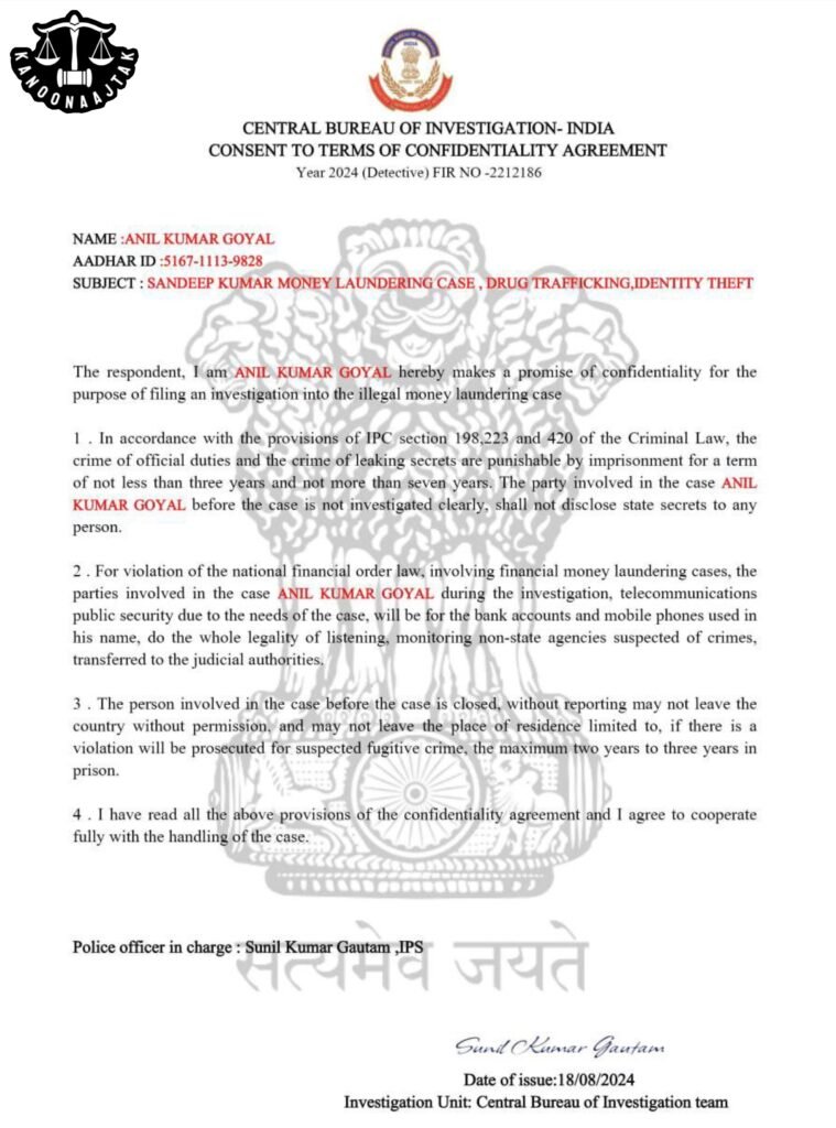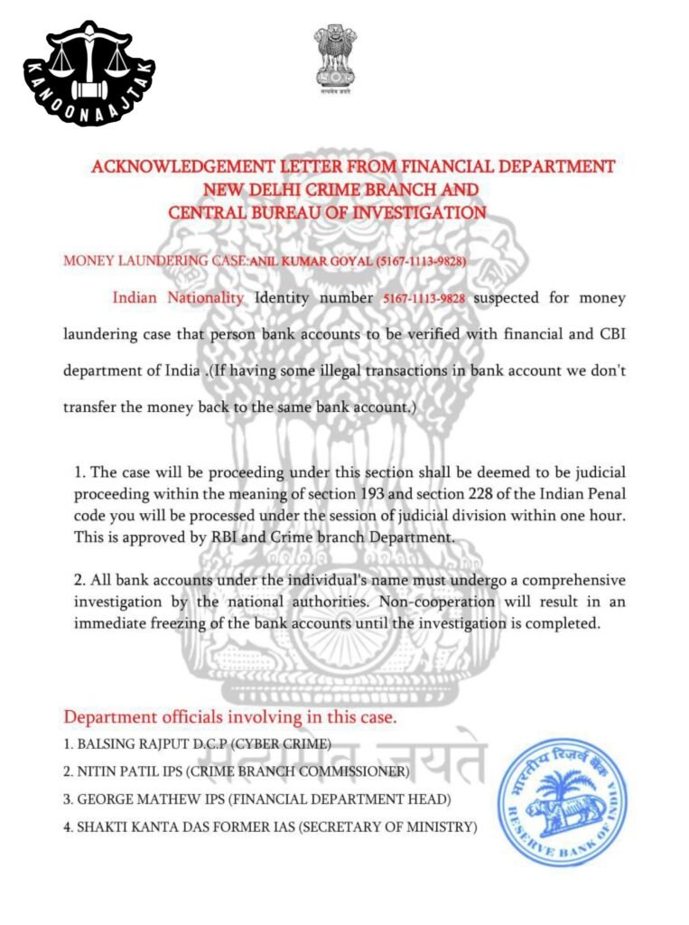लेकिन उस कथित गौतम ने उस सीबीआई के डीसीपी से कहा के की वो इनको इंटरोगेट करेंगे और जांच करेंगे।इसी बीच अधिवक्ता को नई दिल्ली क्राइम ब्रांच और सीबीआई की तरफ से लेटर भी दिए गए जिनमें उनके विरुद्ध मनी लॉन्ड्रिंग का केस बताया गया था।एक लेटर यह भी था कि यह जांच बिल्कुल कॉन्फिडेंशियल है और अधिवक्ता इसके संबध में किसी से चर्चा भी नहीं करेंगे और अगले 24 घंटे तक उनकी निगरानी में रहेंगे और उनको अपनी लोकेशन शेयर करनी होगी।