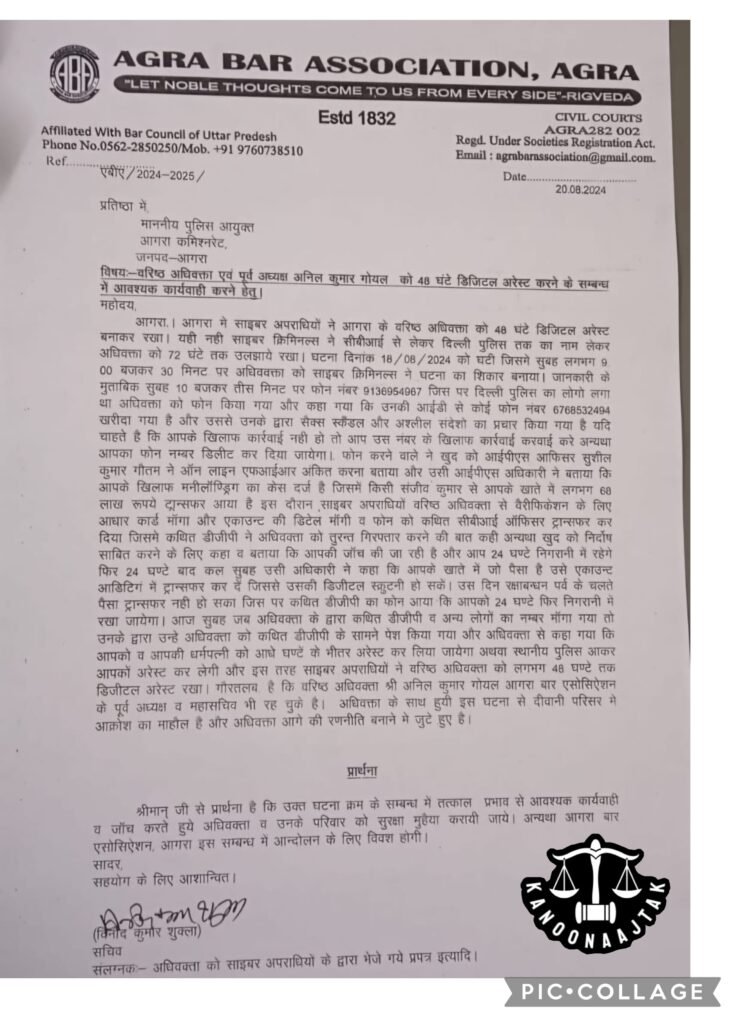 आगरा 20 अगस्त।साइबर अपराधियों के हौसले दिन प्रति दिन बुलंद होते जा रहे है और उनके द्वारा नित्य नए तरीकों से साइबर अपराध को अंजाम दिया जा रहा है।ऐसा ही एक मामला आगरा में सामने आया है जिसमें साइबर अपराधियों ने आगरा के वरिष्ठ अधिवक्ता को 48 घंटे डिजिटल अरेस्ट में रखा। यही नहीं साइबर अपराधियों ने सीबीआई से लेकर दिल्ली पुलिस तक का नाम लेकर वरिष्ठ अधिवक्ता को 72 घंटे तक उलझाये रखा।वरिष्ठ अधिवक्ता अनिल कुमार गोयल आगरा बार एसोसिऐशन के पूर्व अध्यक्ष व महासचिव रह चुके है।