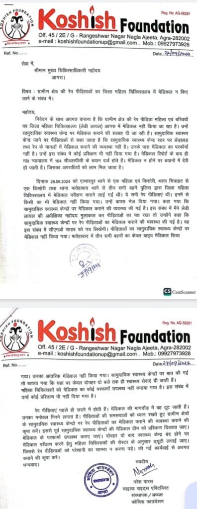 ग्रामीण क्षेत्र की बलात्कार पीड़िता महिला एवं बच्चियों का आगरा के जिला महिला चिकित्सालय (लेडी लायल) मेडिकल नहीं किया जा रहा है। उन्हें अपने क्षेत्र के सामुदायिक स्वास्थ्य केन्द्र पर मेडिकल कराने की सलाह दी जा रही है। सामुदायिक स्वास्थ्य केन्द्र जाने पर पीड़िताओं से कहा जाता है कि सामुदायिक स्वास्थ्य केन्द्र के स्तर पर छेड़छाड़ तथा बलात्कार के मामलों में मेडिकल कराने की व्यवस्था नहीं है।