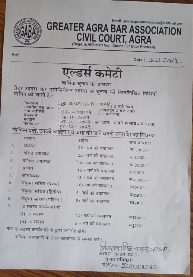 ग्रेटर आगरा बार एसोसिएशन के वार्षिक चुनाव को लेकर कार्यक्रम घोषित कर दिया गया है। एल्डर्स कमेटी के अध्यक्ष/ चुनाव अधिकारी शिवराज सिंह चाहर ने बताया कि नामांकन 18 से 21 नवंबर को होगा।